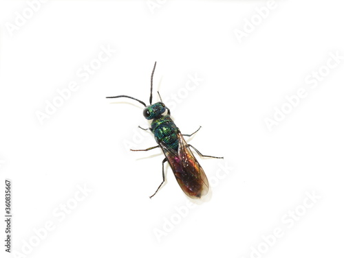 © hhelene, Fototapeta premium The colorful common Chrysis angustula garden cuckoo wasp on white background