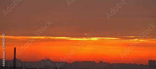 Naklejka premium The colorful dramatic sunset sky in an industrial zone of a city.Silhouettes of house and chimneys.