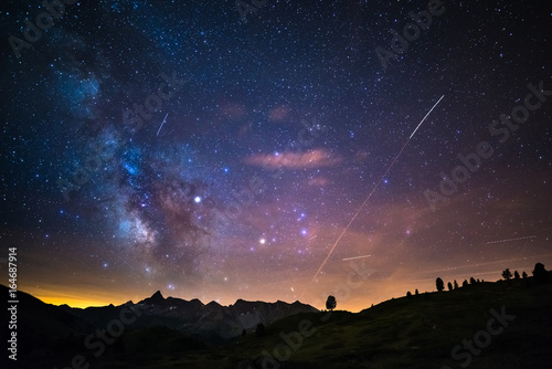 © fabio lamanna, Fototapeta premium The colorful glowing core of the Milky Way and the starry sky captured at high altitude in summertime on the Italian Alps, Torino Province. Airplane traffic in the sky.