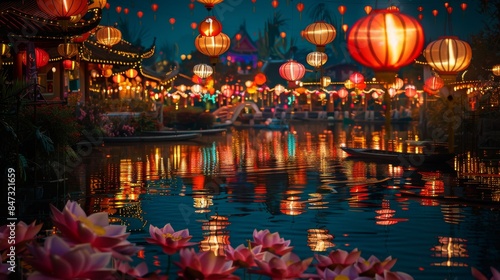 © Nicolas, Obraz premium The colorful lanterns illuminate the river during the festival.