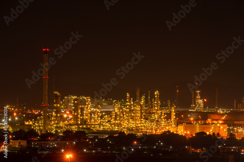 © APchanel, Fototapeta premium The colorful lights in oil refinery industry power station at night time with Twilight sky ,Chonburi,Thailand.