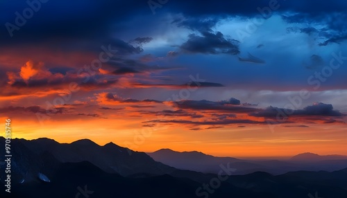 © Elif, Fototapeta premium The colorful sky with blue and orange hues creates a dramatic backdrop against the silhouetted mountains.