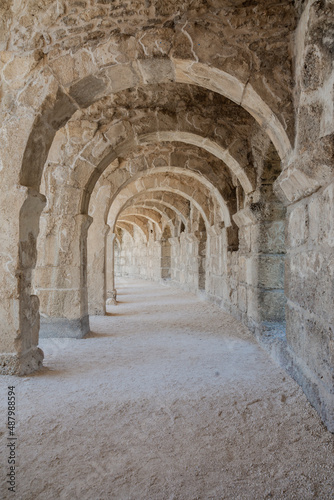 © Yasin, Naklejka premium The columned Arch gallery above the auditorium-theatre in the Ancient Roman Theater of Aspendos. Arch in ancient amphitheater.