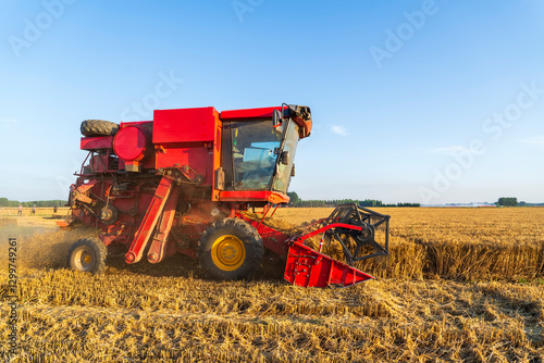 © zhengzaishanchu, Obraz premium The combine is harvesting the wheat in the evening