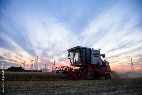 © zhengzaishanchu, Obraz premium The combine is harvesting the wheat in the evening