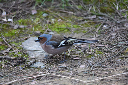 Obraz premium The common chaffinch or simply the chaffinch is a common and widespread small passerine bird in the finch family. The male is brightly coloured with a blue-grey cap and rust-red underparts. The female