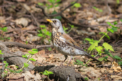 © EvgeniaSevryukova, Fototapeta premium The common fieldfare sitting on the ground