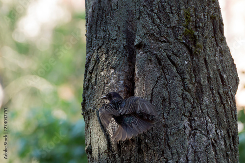 © ostapenkonat, Obraz premium The Common Starling, Sturnus vulgaris is flying with some insect to feed its chick, the young bird is opening its beak to be feeded, pretty golden light, green background