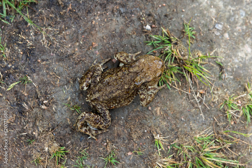 Fototapeta premium The common toad is on a dirty ground, top view