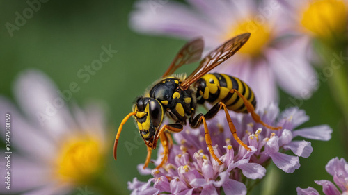 © Dionysius, Fototapeta premium The common wasp (Vespula vulgaris) sucks the nectar from beautiful flowers