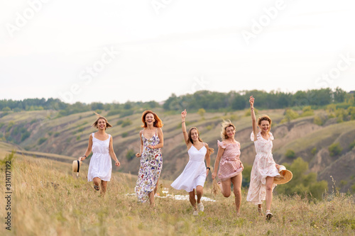 © Kate, Obraz premium The company of cheerful female friends have a great time together on a picnic in a picturesque place overlooking the green hills. Girls in white dresses dancing in the field