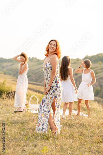 © Kate, Fototapeta premium The company of happy female friends having fun and dancing outside in a picnic at hills.