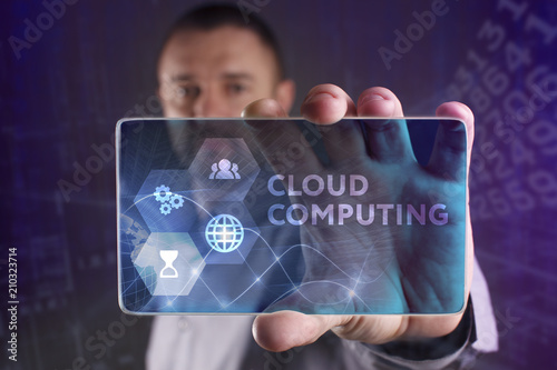 © photon_photo, Fototapeta premium The concept of business, technology, the Internet and the network. A young entrepreneur working on a virtual screen of the future and sees the inscription: Cloud computing