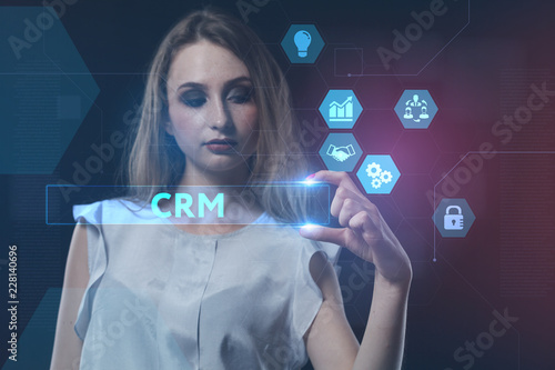 © photon_photo, Fototapeta premium The concept of business, technology, the Internet and the network. A young entrepreneur working on a virtual screen of the future and sees the inscription: CRM