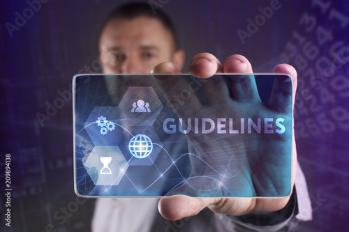 Fototapeta premium The concept of business, technology, the Internet and the network. A young entrepreneur working on a virtual screen of the future and sees the inscription: Guidelines