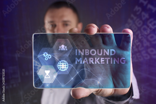 © photon_photo, Fototapeta premium The concept of business, technology, the Internet and the network. A young entrepreneur working on a virtual screen of the future and sees the inscription: Inbound marketing