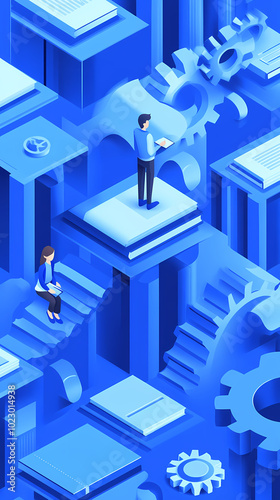 © ak159715, Naklejka premium The concept of engineer education, gears and cogs composition isometric 3D vector illustration, studying science at university, and learning engineering.