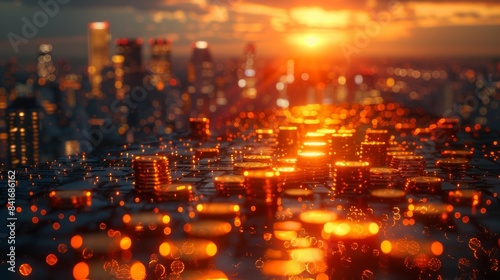 Fototapeta premium The concept of finance and banking is demonstrated by a double exposure of the city and rows of coins