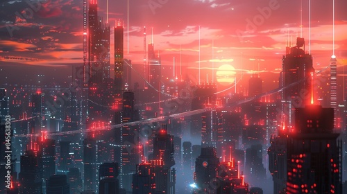 © WrongWay, Obraz premium The concept of high-speed internet connection visualized as glowing cable webs sending digital data over spectacular futuristic cyberpunk cityscape