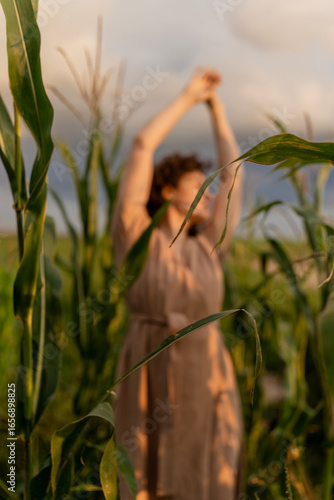 © Alena, Obraz premium The concept of love for nature. Young woman with curly hair stretching in a cornfield during sunset, wearing a beige dress with a blurred background.