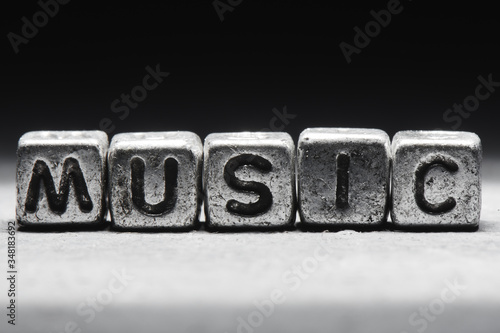 © amixstudio, Naklejka premium The concept of music. The inscription on metal 3D cubes isolated on a black background, grunge style