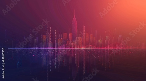 Fototapeta premium The concept of smart city infrastructure is visualized with abstract dots connecting gradient lines, illustrating intricate wave designs and big data connection technologies.