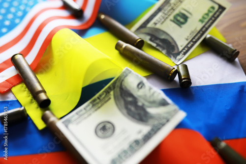 © alexkich, Fototapeta premium The concept of support in a military conflict. Solidarity. Politics. The flags are on the table.