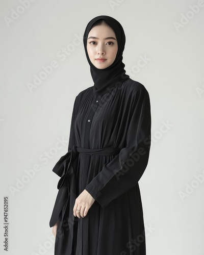 © Leli, Fototapeta premium The confident Muslim woman elegantly stands wearing a sleek black hijab and a flowing outfit Her poised demeanor reflects self assurance and modern style against a simple background