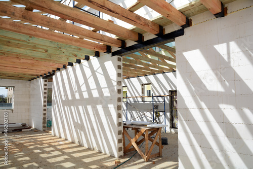 Fototapeta premium The construction of the thermo house. The construction of the thermo house. Wooden frame building. Wooden roof construction. TFB system comprises thermo blocks filled with concrete.