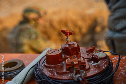 Fototapeta premium The control panel for antipersonnel mines. Military exercises.