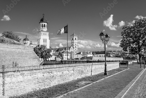© PhotoFires, Fototapeta premium The coronation orthodox cathedral and the catholoc cathedral inside Alba Carolina citadel in Alba Iulia, Transylvania, Romania in black and white