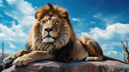 Naklejka premium The courageous lion on the rock in jungle with a blue sky
