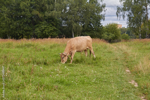 © Тимур Кропотин, Obraz premium The cow grazes in the field and eats juicy grass.