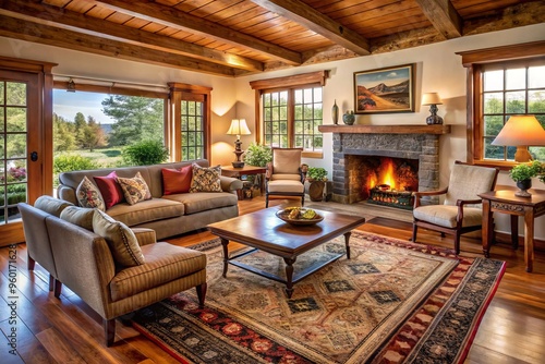 © kansak01, Naklejka premium The cozy ranch-style living room features wooden furniture, a vibrant patterned rug, and a stunning antique fireplace
