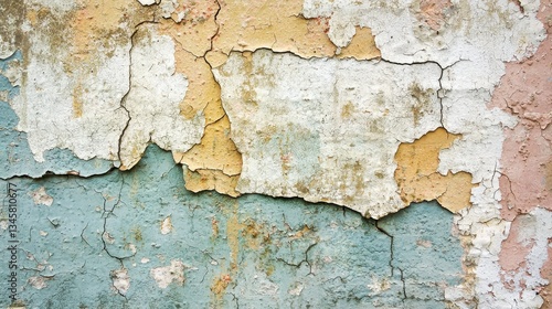 Obraz premium The cracked and weathered surface of a painted wall is shown
