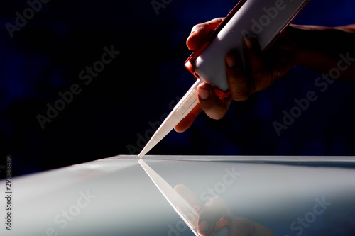 © noprati, Fototapeta premium The craftsman's hand uses a silicone caulking gun for general and industrial applications.