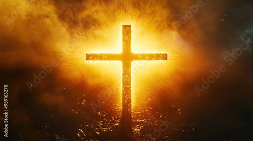 Fototapeta premium The cross of the Lord bathed in golden rays of the sun, symbolizing faith,...
