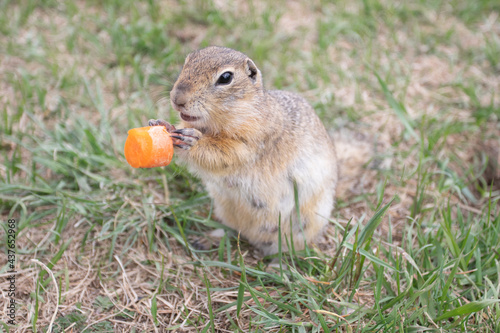 © epovdima, Fototapeta premium The cute Groundhogs eating while standing and looking.