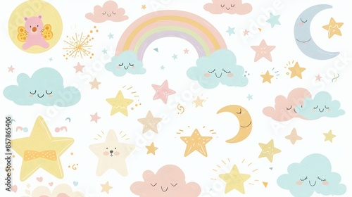 © Bundi, Fototapeta premium The cutest moon, rainbow, cloud, planet, and star clipart set for baby room decoration, a modern cartoon mix of moons and stars.