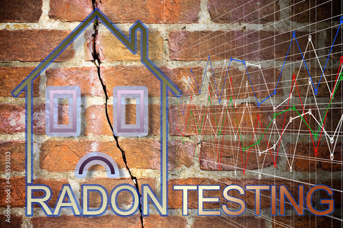 Fototapeta premium The danger of radon gas in our homes - Radon Testing concept image with an outline of a small house with radon text against an old cracked brick wall