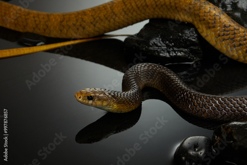 Fototapeta premium The dark background contrasts with the snake sleek body, highlighting its...