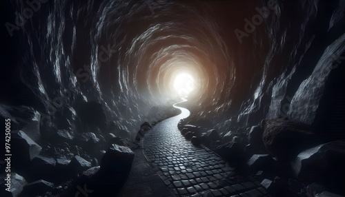 © Bening, Obraz premium The dark rock tunnel with light illuminated in the end, 3d rendering – Generative AI