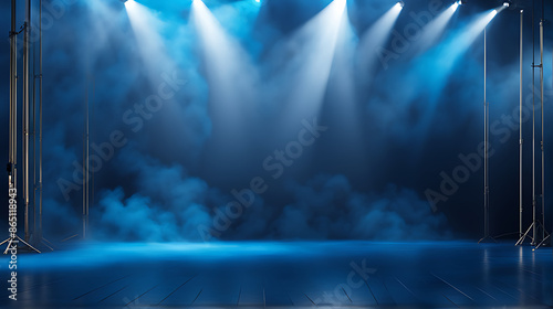 © Five Million Stock, Fototapeta premium The dark scene has a smoky dark blue background. Empty dark room with spotlights for displaying product design