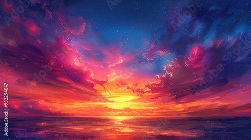 © Oleg, Fototapeta premium The darkness of the night sky is dominated by a dark blue shade that turns purple and orange-yellow near the horizon. Shades are mixed in a smooth gradient, as if the world is waking up to a new day