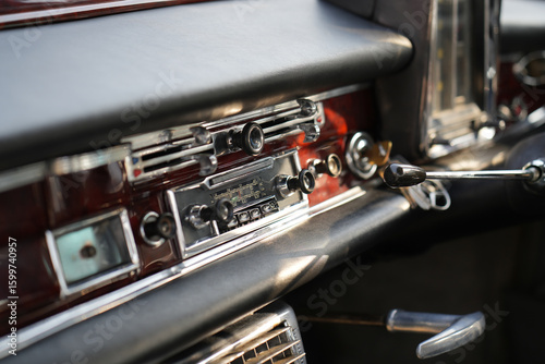 Naklejka premium The dashboard of a vintage classic car features detailed analog gauges, a radio, and air vents in polished wood and chrome, offering a fresh yet luxurious look.