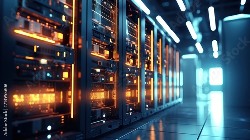 © muji, Fototapeta premium The data center's server room boasts advanced features for backup, mining, hosting, mainframes, and computer racks with storage information.