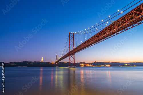 Obraz premium The 25 de Abril bridge over the Tajo River with Cristo Rei or Christ the King in the background. Lisbon. Portugal