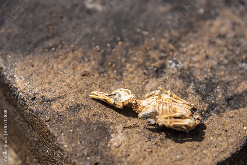Fototapeta premium The dead bird was dry, leaving only a skeleton on the cement floor.