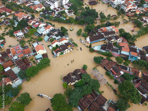 © jangnhut, Fototapeta premium The deepest flood in history in Hoi An, Da Nang 2025. Aerial view of flooded ancient Asian town with yellow houses and brown roofs, showing severe urban flooding and climate disaster impact