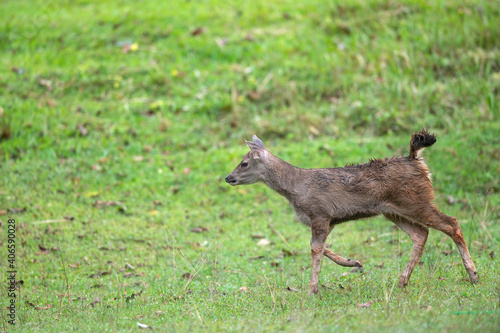 © chamnan phanthong, Fototapeta premium The deer is walking on the green lawn.